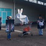 Des militants de L214 mobilisés devant le Carrefour de la Toison d’Or à Dijon pour dénoncer l’élevage intensif