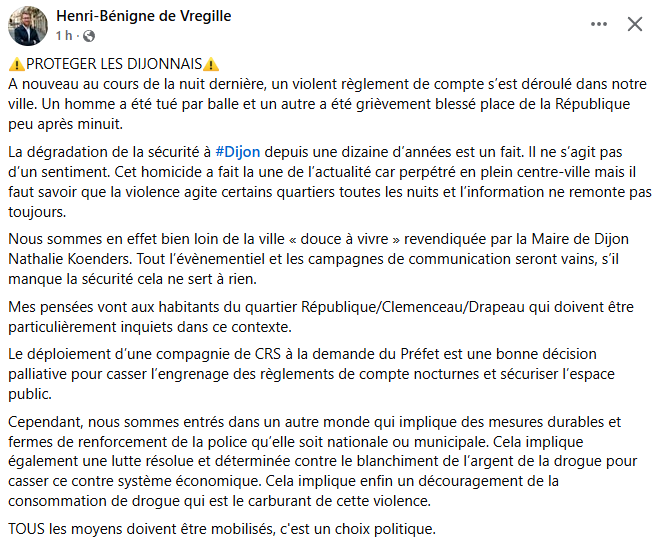 Face à ce drame, Henry-Bénigne de Vregille a réagi dès ce dimanche matin sur les réseaux sociaux. Dans un message intitulé « PROTÉGER LES DIJONNAIS », il dénonce une situation devenue « intenable » :