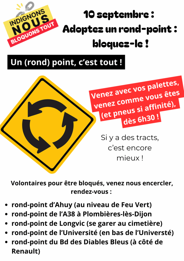 Le mouvement social Bloquons tout prépare une journée de mobilisation mercredi 10 septembre. Selon un message circulant parmi les participants, plusieurs ronds-points de la métropole dijonnaise pourraient être investis dès 6h30 du matin. La liste évoquée comprend :