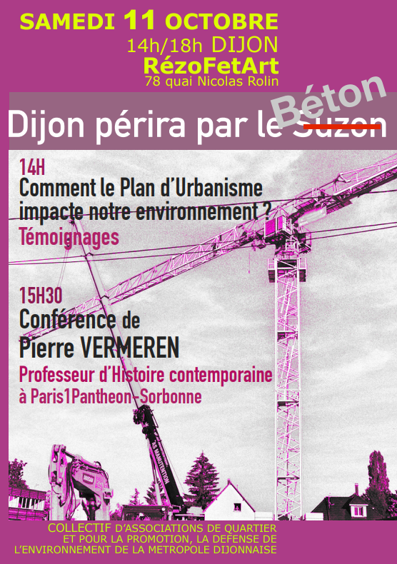 Le Collectif des Associations de Quartier et pour la Promotion, la Défense de l’Environnement de la Métropole dijonnaise organise, le samedi 11 octobre de 14h à 18h, un après-midi de réflexion et de débats au RézoFetArt (78 quai Nicolas Rolin). L’événement, intitulé « Dijon périra par le béton », veut sensibiliser les habitants aux conséquences du développement urbain intensif dans la métropole dijonnaise.