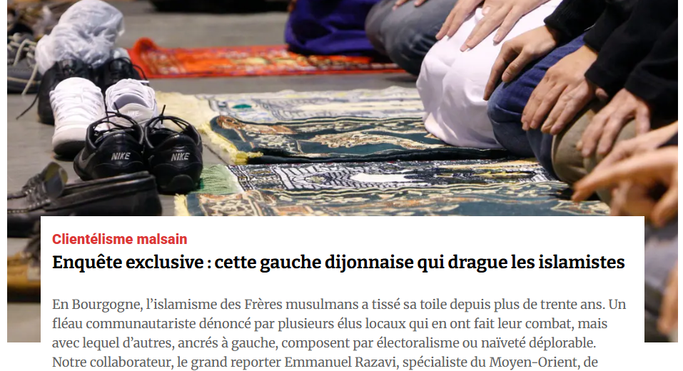 Dans le deuxième volet, « Enquête exclusive : cette gauche dijonnaise qui drague les islamistes », Emmanuel Razavi aborde un autre versant du malaise dijonnais : les relations ambiguës entre certains élus de gauche et des acteurs de la mouvance islamiste locale. L’enquête met notamment en cause des représentants municipaux accusés de complaisance avec des organisations proches des Frères musulmans, comme la Jeunesse Musulmane de France en Bourgogne et son imam influent, Mohamed Ateb. À travers témoignages et documents, Razavi décrit un clientélisme communautaire qui, selon plusieurs sources locales, aurait contribué à ancrer durablement un islam politique dans la région. La mairie, contactée, a refusé de répondre aux questions du journaliste.