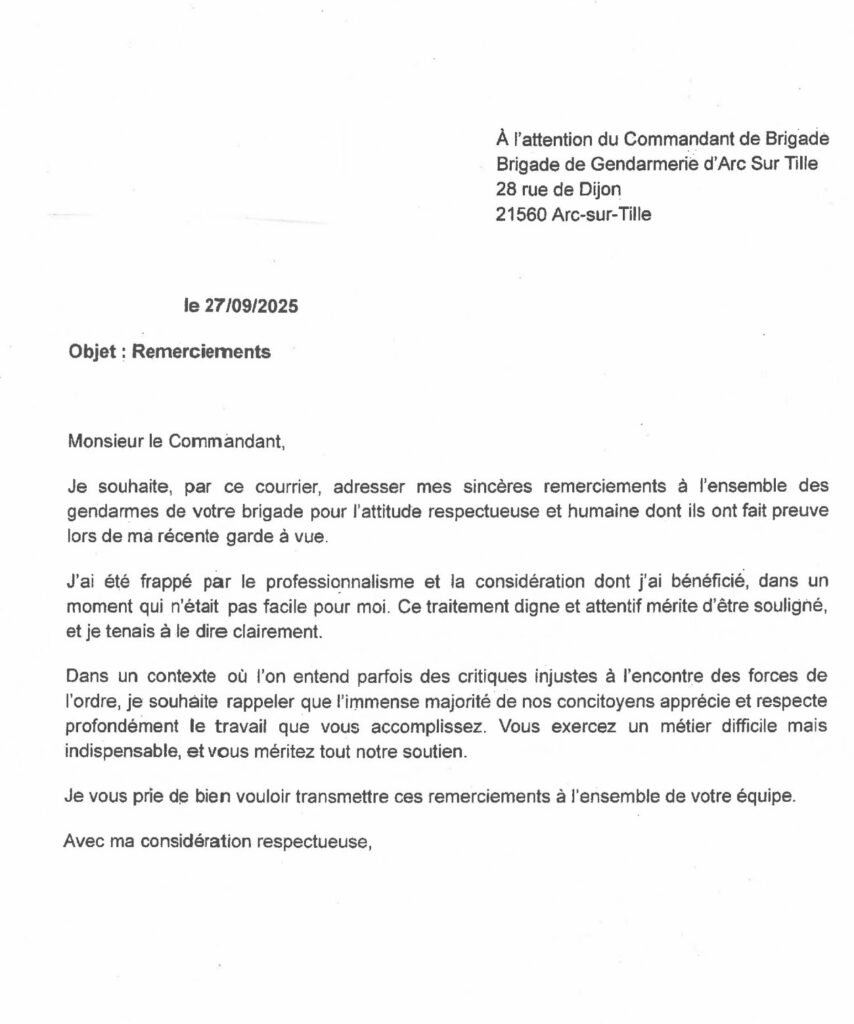C’est ce qu’on appelle sortir de garde à vue du bon pied. À Arc-sur-Tille, en Côte-d’Or, les gendarmes ont eu la surprise de recevoir une lettre… de remerciements. Oui, oui, vous avez bien lu : des remerciements, signés par un homme tout juste sorti de garde à vue.