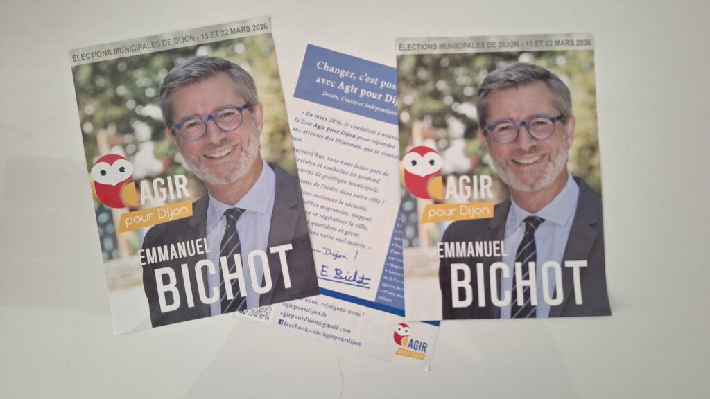 La campagne est désormais officiellement lancée pour Emmanuel Bichot, candidat du mouvement Agir pour Dijon, en vue des prochaines élections municipales prévues en mars prochain. Depuis quelques jours, plusieurs milliers de tracts ont été distribués dans les boîtes aux lettres des Dijonnaises et des Dijonnais. Dans ce document, l’élu d’opposition annonce clairement la couleur : « En mars prochain, je conduirai à nouveau la liste Agir pour Dijon pour répondre aux attentes des Dijonnais, que je connais bien », peut-on lire sur le tract.