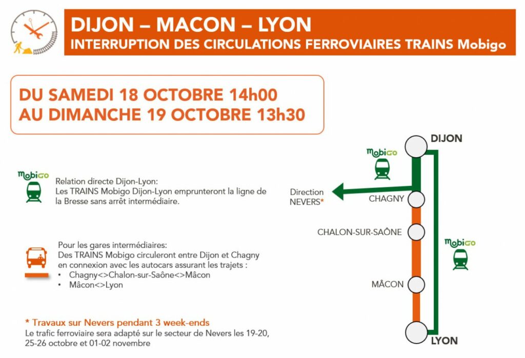 • Un service de substitution par autocars assurera les trajets Chagny – Chalon-sur-Saône – Mâcon ainsi que Mâcon – Lyon, en correspondance avec les trains Mobigo.