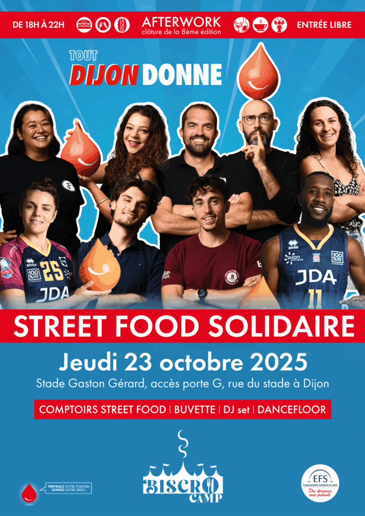 Ce soir, de 18h à 22h, la capitale des Ducs se transforme en véritable temple de la street food et de la solidarité ! Le Biscrocamp – Comptoirs Nomades clôture en beauté l’opération « Tout Dijon Donne » organisée par l’Établissement Français du Sang (EFS) Bourgogne Franche-Comté, dans une ambiance festive et conviviale.