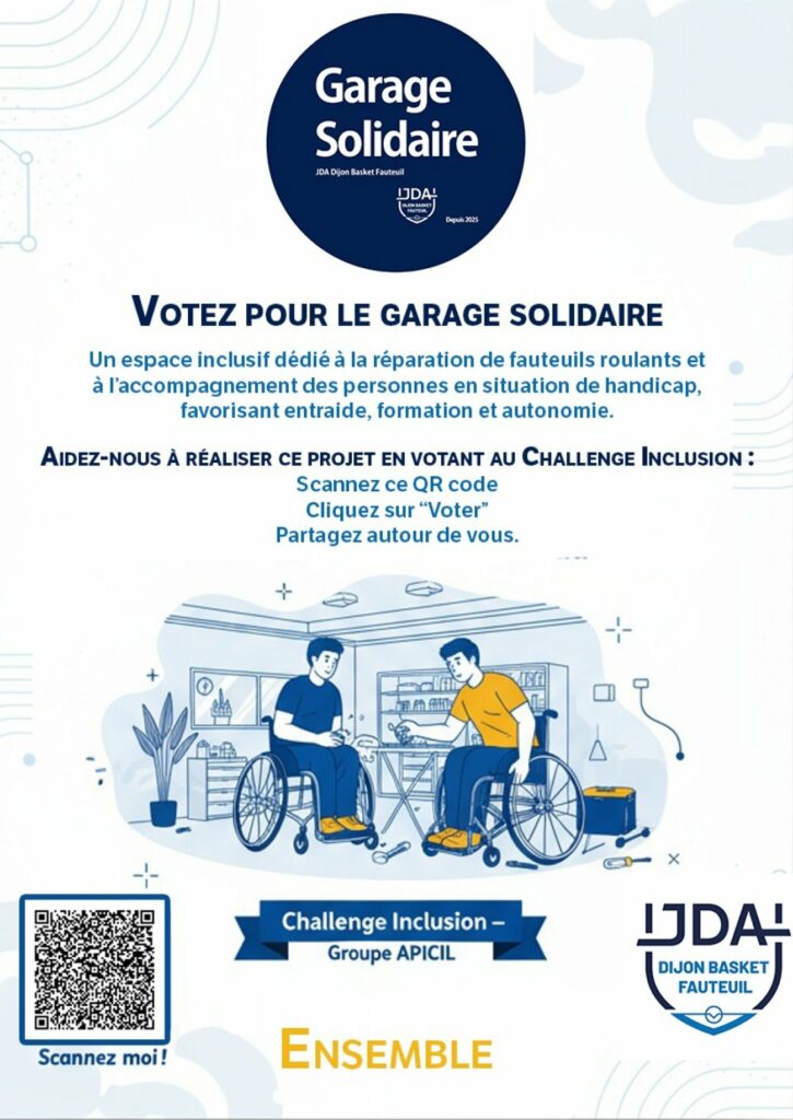Porté par la JDA Dijon Basket Fauteuil, le Garage Solidaire de fauteuil roulant a été sélectionné pour participer au Challenge Inclusion 2025 du Groupe APICIL. Une belle reconnaissance pour ce projet innovant, ancré dans les valeurs d’entraide, d’accessibilité et d’inclusion que défend depuis plusieurs années le club dijonnais.