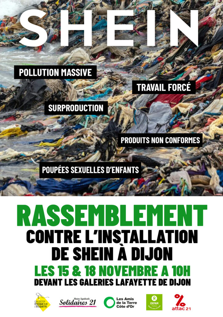 L’affiche de mobilisation, publiée cette nuit par les collectifs Éthique sur l’Étiquette, Solidaires 21, Les Amis de la Terre Côte-d’Or, Oxfam France et Attac 21, compile une série de griefs attribués à l’entreprise. Les organisations pointent notamment du doigt la surproduction textile, la pollution massive, des conditions de travail jugées abusives ou encore des produits ne respectant pas certaines normes européennes. Elles affirment également vouloir alerter sur des dérives plus graves qu’elles associent à la plateforme, tout en dénonçant l’impact environnemental et social du modèle économique de la fast-fashion.