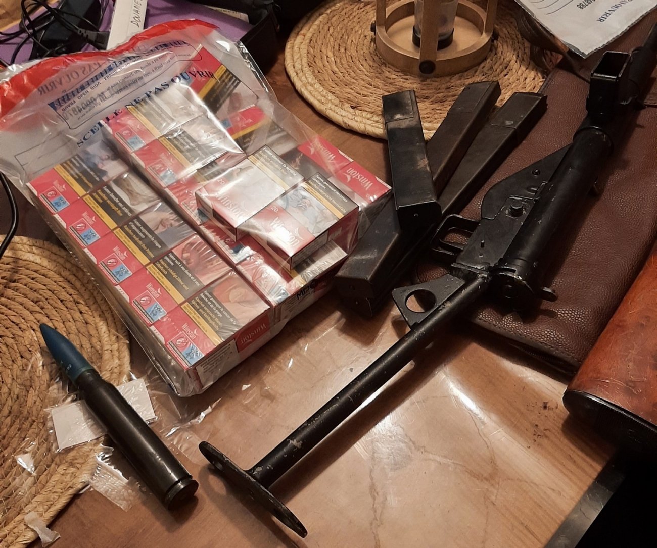 Sur instruction du parquet, une visite domiciliaire avait été menée le 23 janvier 2025. Elle avait permis la découverte de 2 950 € en espèces, 29 paquets de cigarettes luxembourgeois, une compteuse à billets, ainsi que des cartons d’emballage de marques de tabac. Des armes avaient également été retrouvées et remises aux gendarmes. Un blanchiment douanier portant sur les 2 950 € avait alors été notifié.