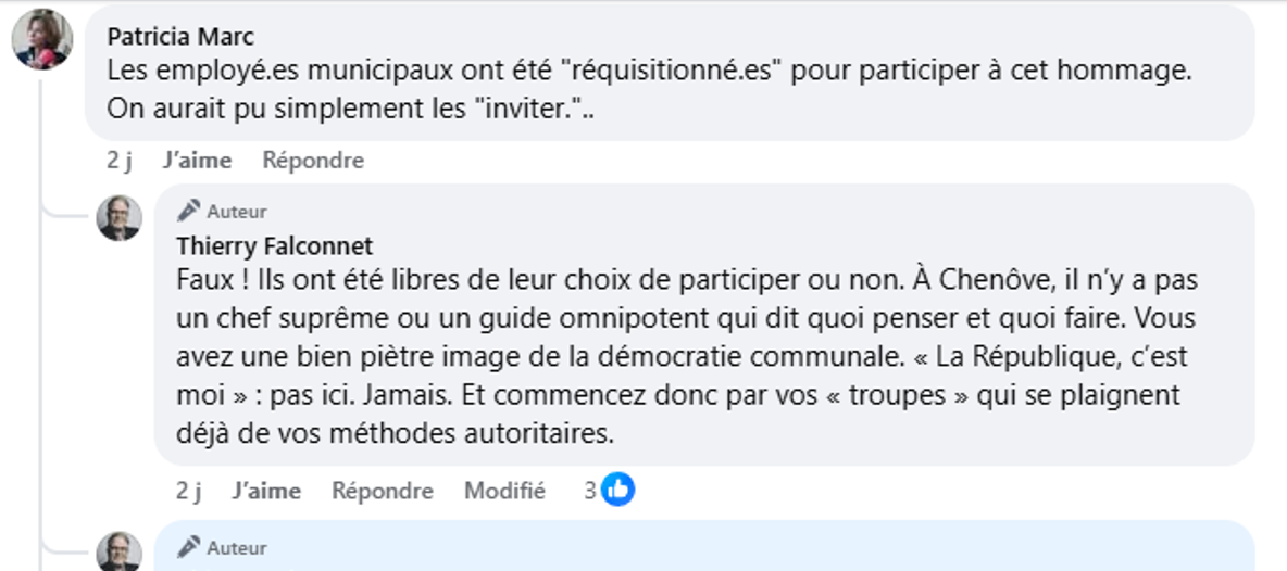 La réponse de Thierry Falconnet se veut ferme et sans détour : « Faux ! Ils ont été libres de leur choix de participer ou non. À Chenôve, il n’y a pas un chef suprême ou un guide omnipotent qui dit quoi penser et quoi faire. Vous avez une bien piètre image de la démocratie communale. « La République, c’est moi » : pas ici. Jamais. Et commencez donc par vos « troupes » qui se plaignent déjà de vos méthodes autoritaires ».