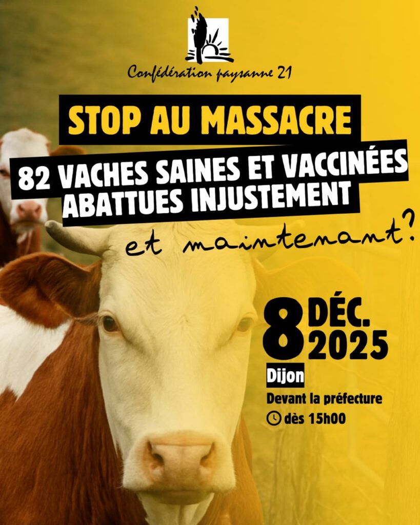 Face à la situation, la Confédération Paysanne 21 appelle à une mobilisation générale. Un rassemblement est prévu le lundi 8 décembre 2025 à 15h, devant la préfecture de Dijon, pour dénoncer les « abattages systématiques, arbitraires et immédiats » et demander un changement de cap dans la gestion de la DNC.