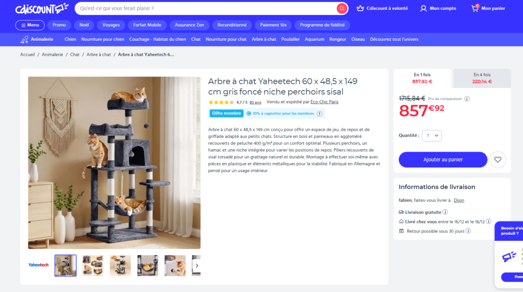 Autre élément surprenant : la possibilité offerte par Cdiscount de régler l’achat en 4 mensualités de 220,14 €. Un système de paiement fractionné qui donne l’impression d’un produit de luxe, alors qu’il s’agit d’un simple arbre à chat destiné à remplacer celui abîmé de “mimine”.