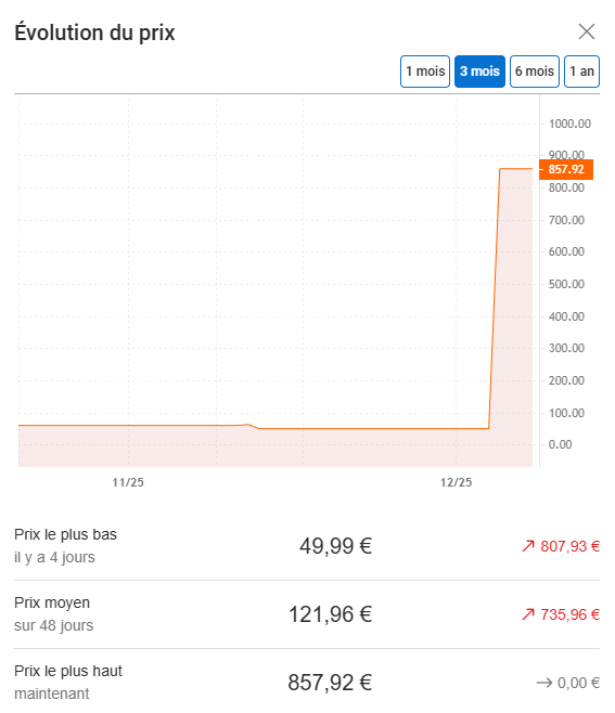 Le 4 décembre 2025, l’article apparaissait encore à 49,99 €, comme n’importe quel arbre à chat de gamme standard. Le 8 décembre, il culminait à 857,92 €, une augmentation supérieure à 1 600 %. Aucune signalisation particulière, aucune rupture de stock indiquée, aucun changement de vendeur clairement visible. Juste un prix devenu, du jour au lendemain, totalement disproportionné.