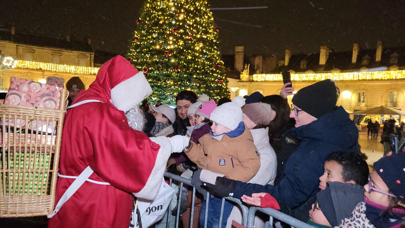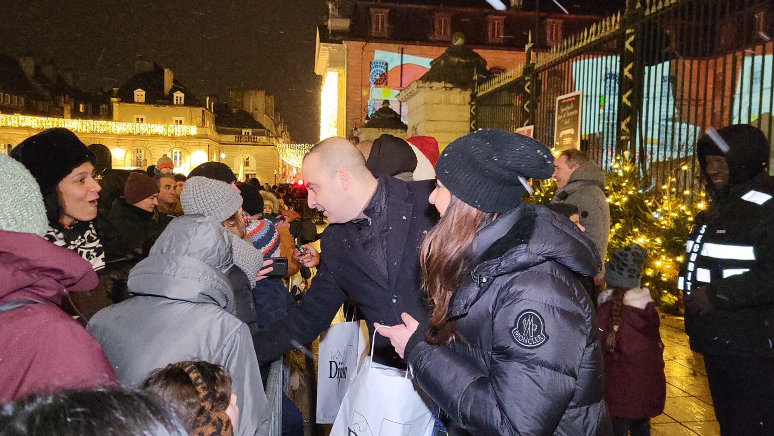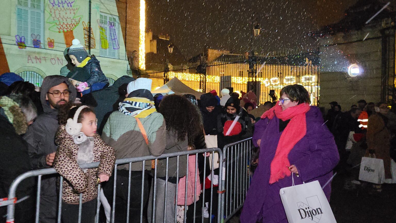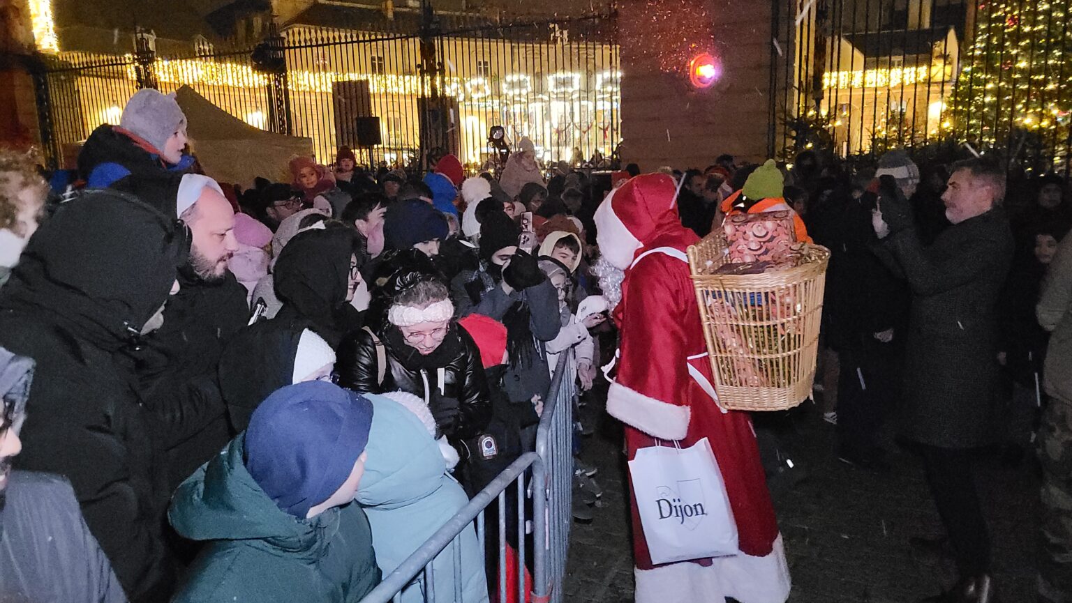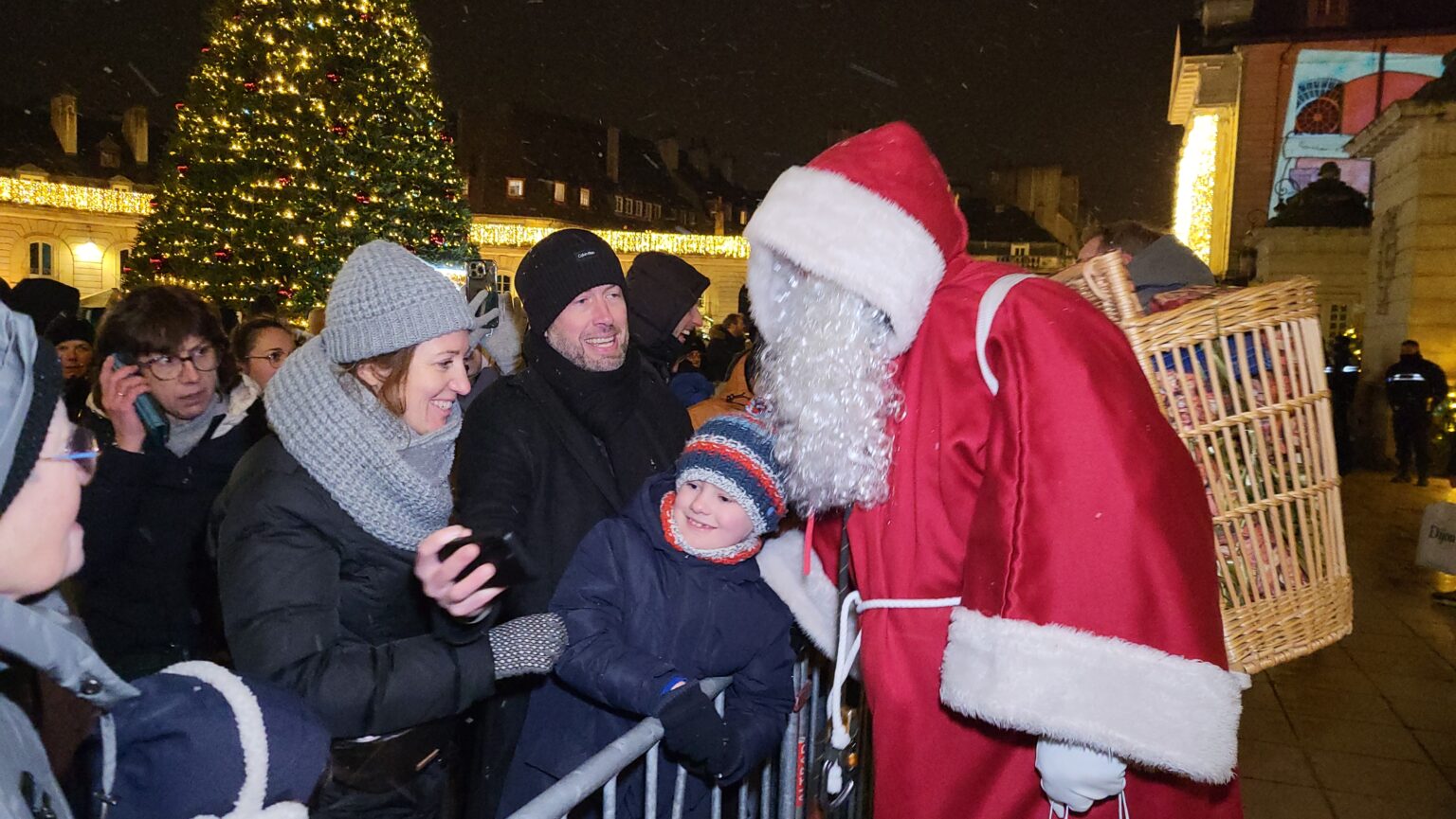 À 18 h 30 précises, le Père Noël est apparu au sommet de la tour Philippe le Bon. Selon les services municipaux, 5 000 personnes étaient alors rassemblées devant l’Hôtel de Ville. Au fil de sa descente de 46 mètres, il a été acclamé par une foule enthousiaste, avant de rejoindre le sol pour distribuer papillotes et places de manèges. Nathalie Koenders, maire de Dijon, l’a accueilli aux côtés de plusieurs élus municipaux.