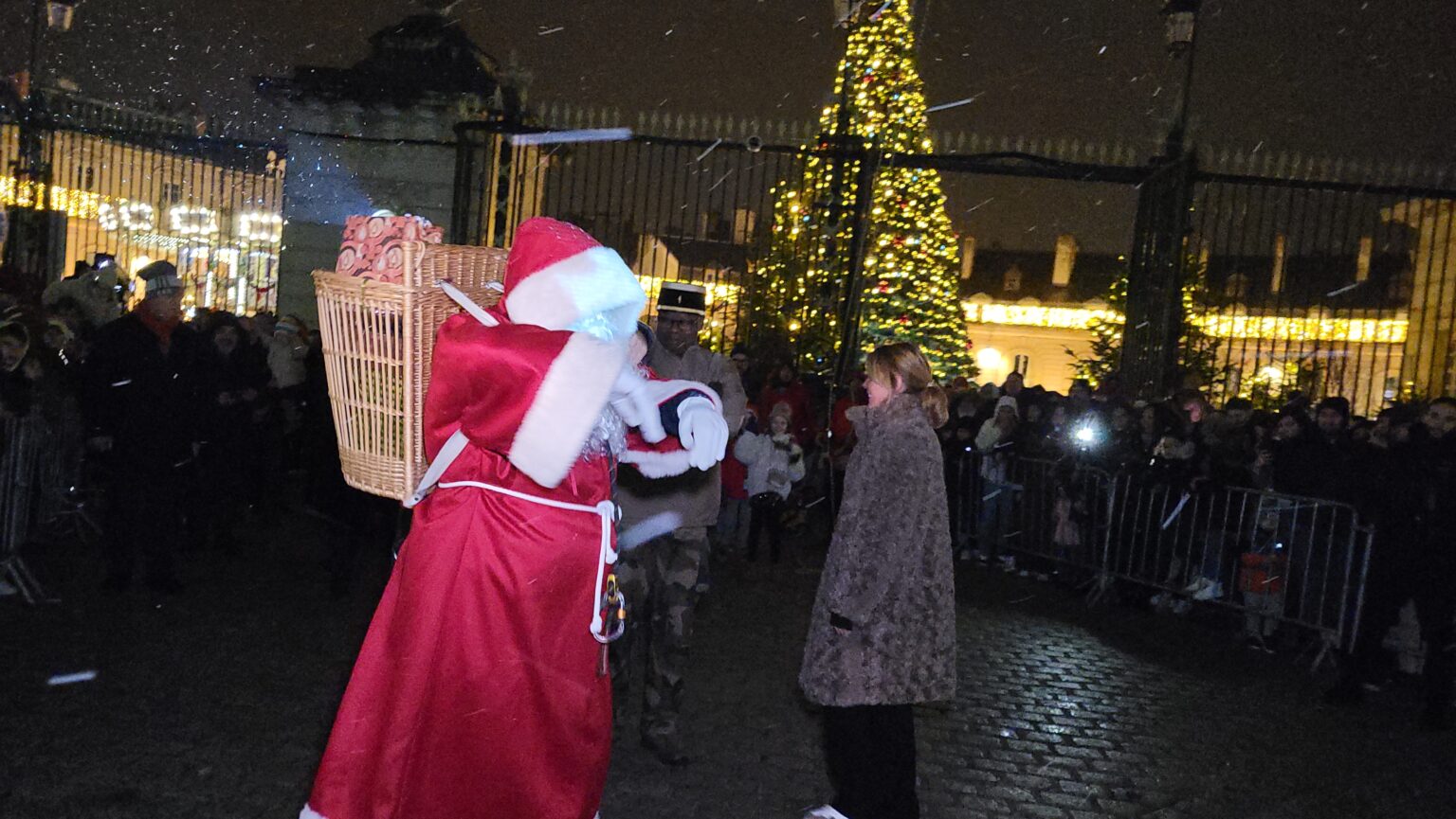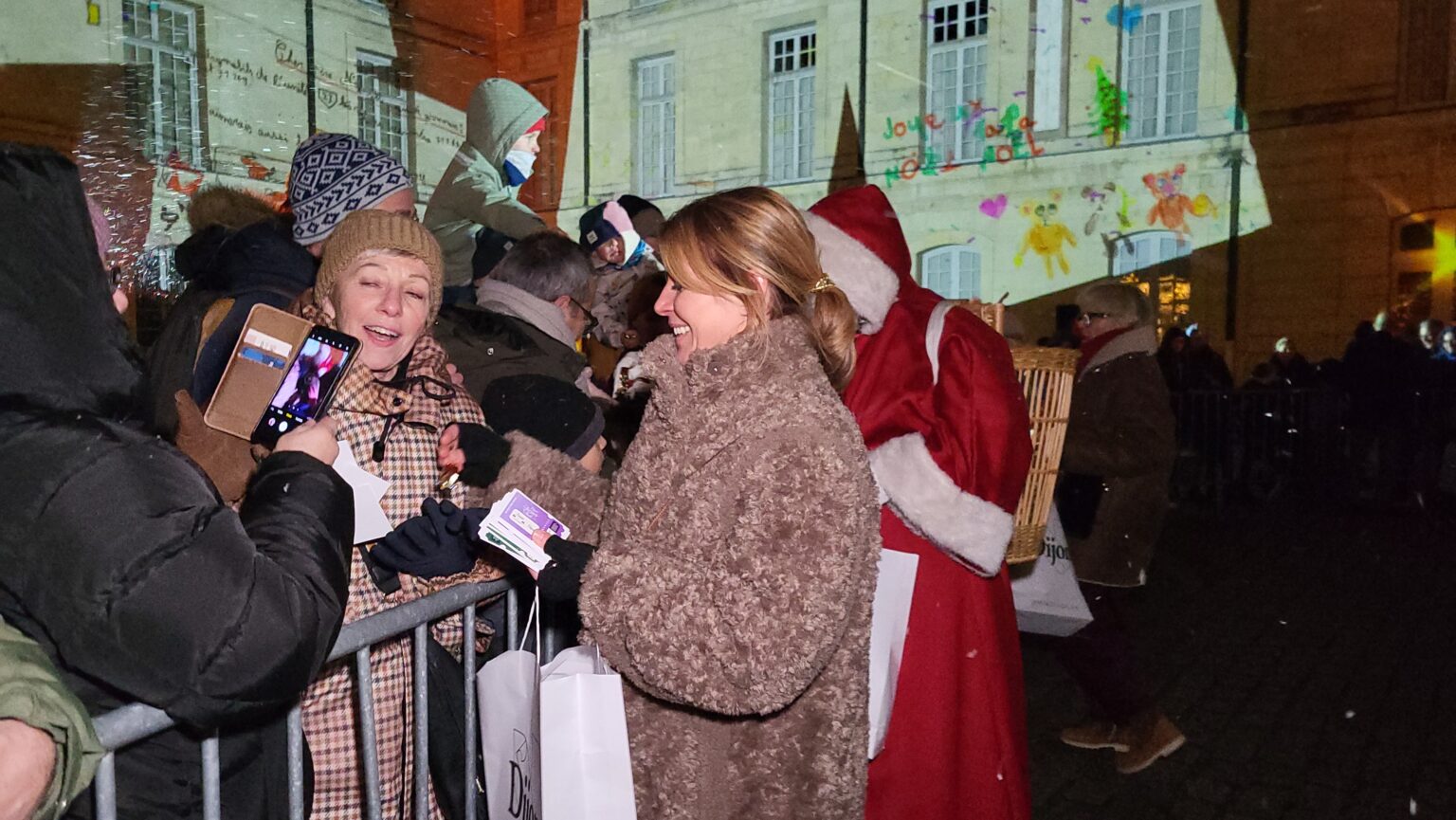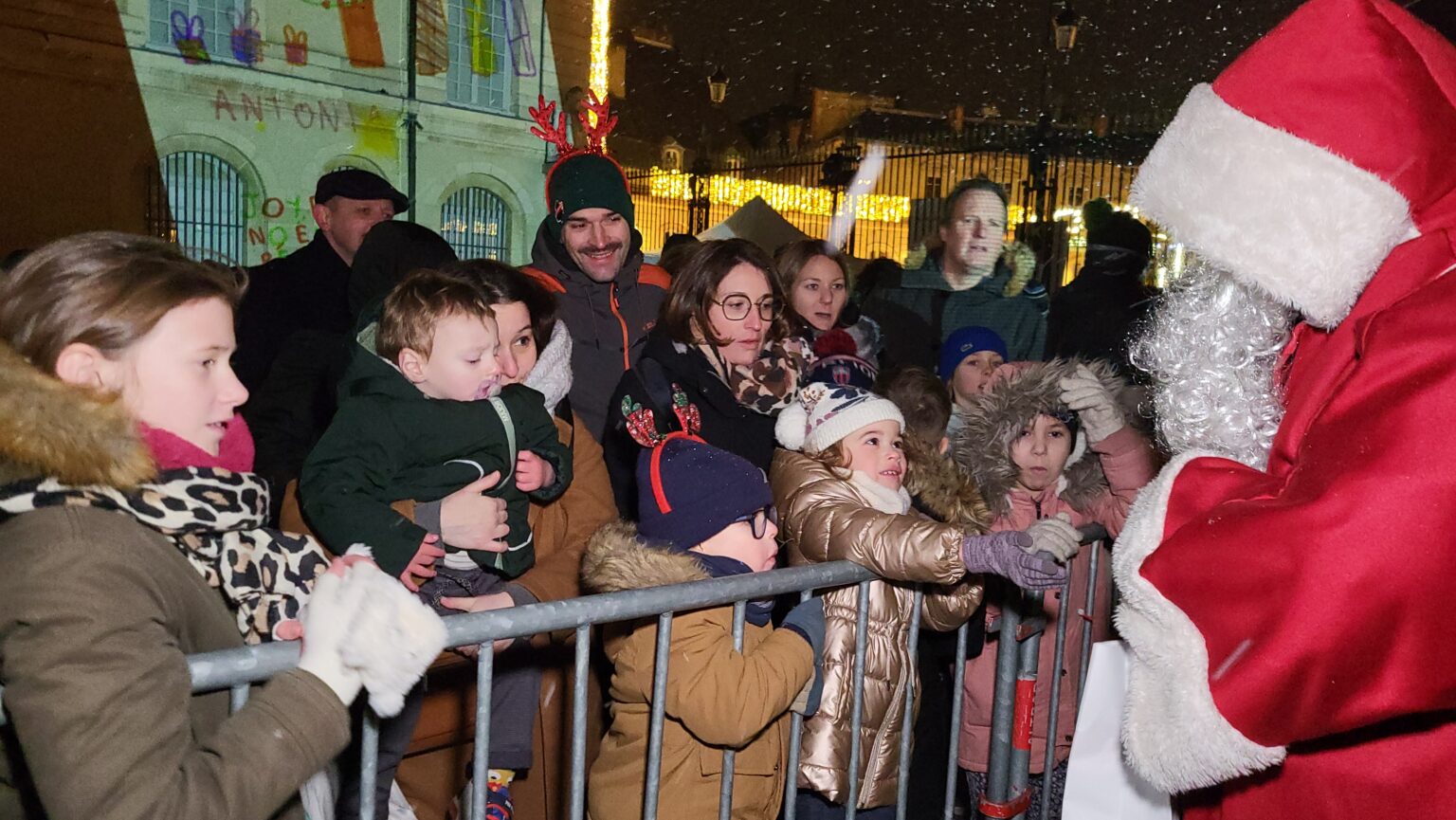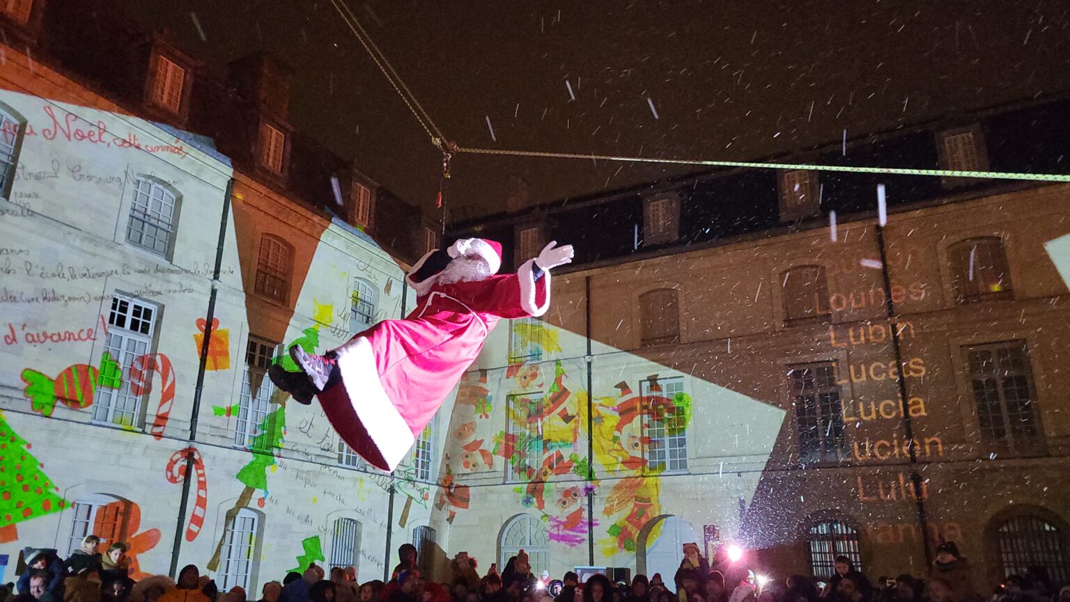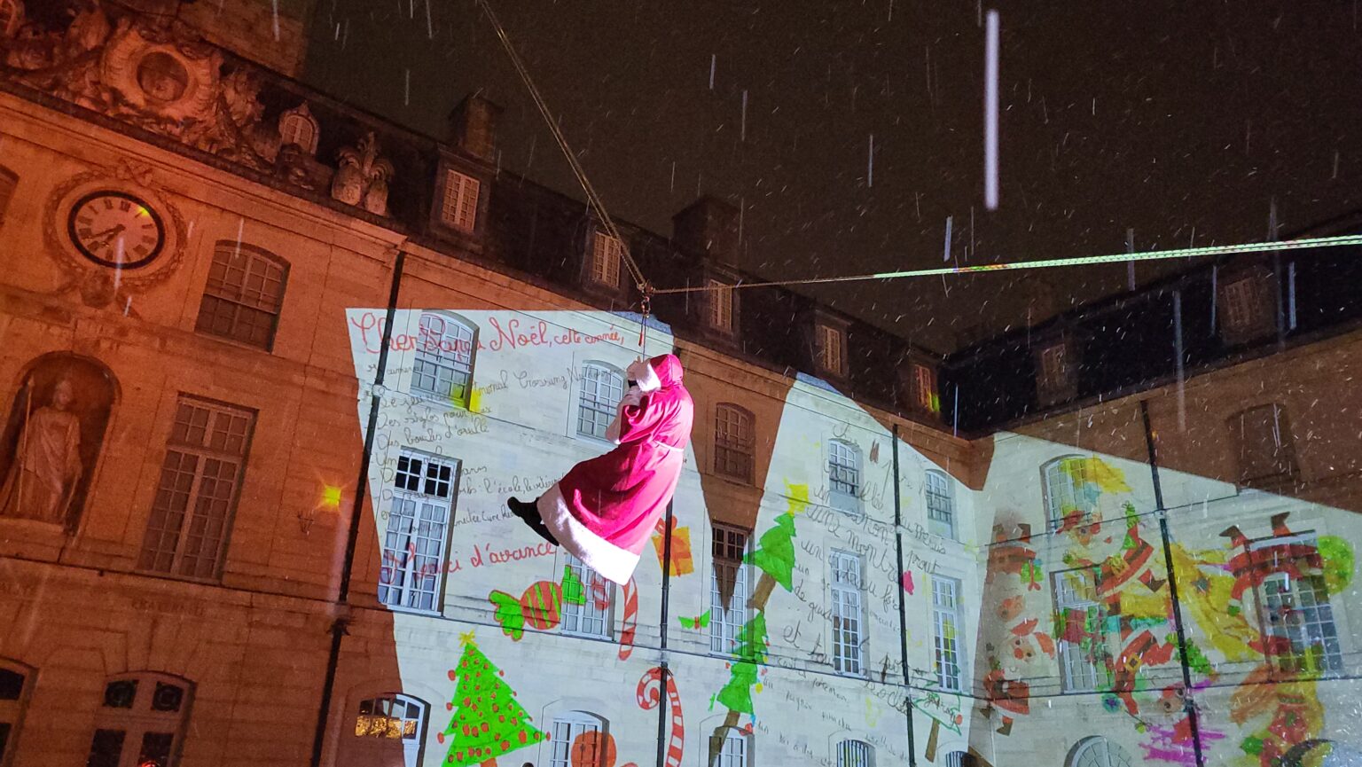 À 18 h 30 précises, le Père Noël est apparu au sommet de la tour Philippe le Bon. Selon les services municipaux, 5 000 personnes étaient alors rassemblées devant l’Hôtel de Ville. Au fil de sa descente de 46 mètres, il a été acclamé par une foule enthousiaste, avant de rejoindre le sol pour distribuer papillotes et places de manèges. Nathalie Koenders, maire de Dijon, l’a accueilli aux côtés de plusieurs élus municipaux.