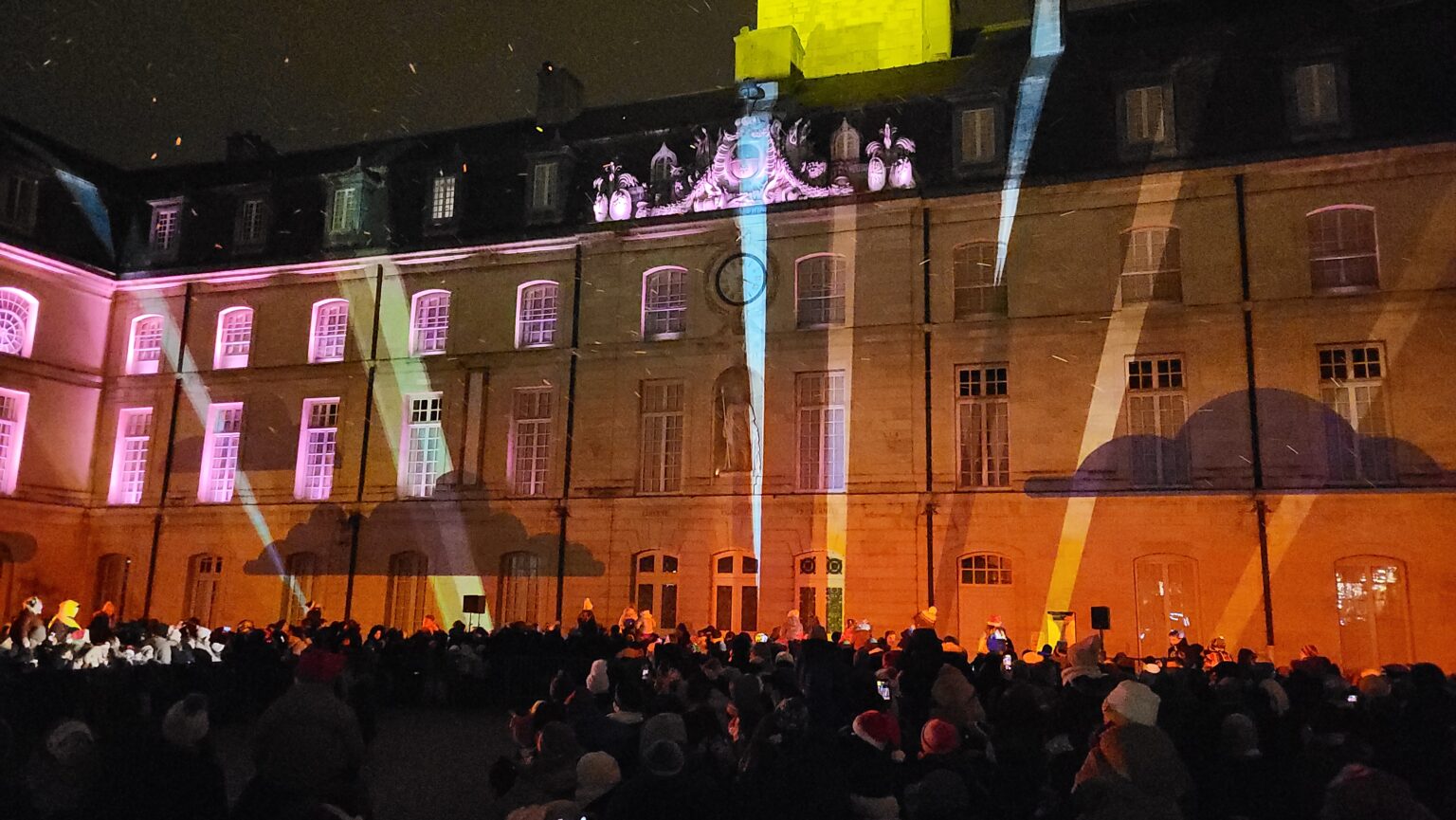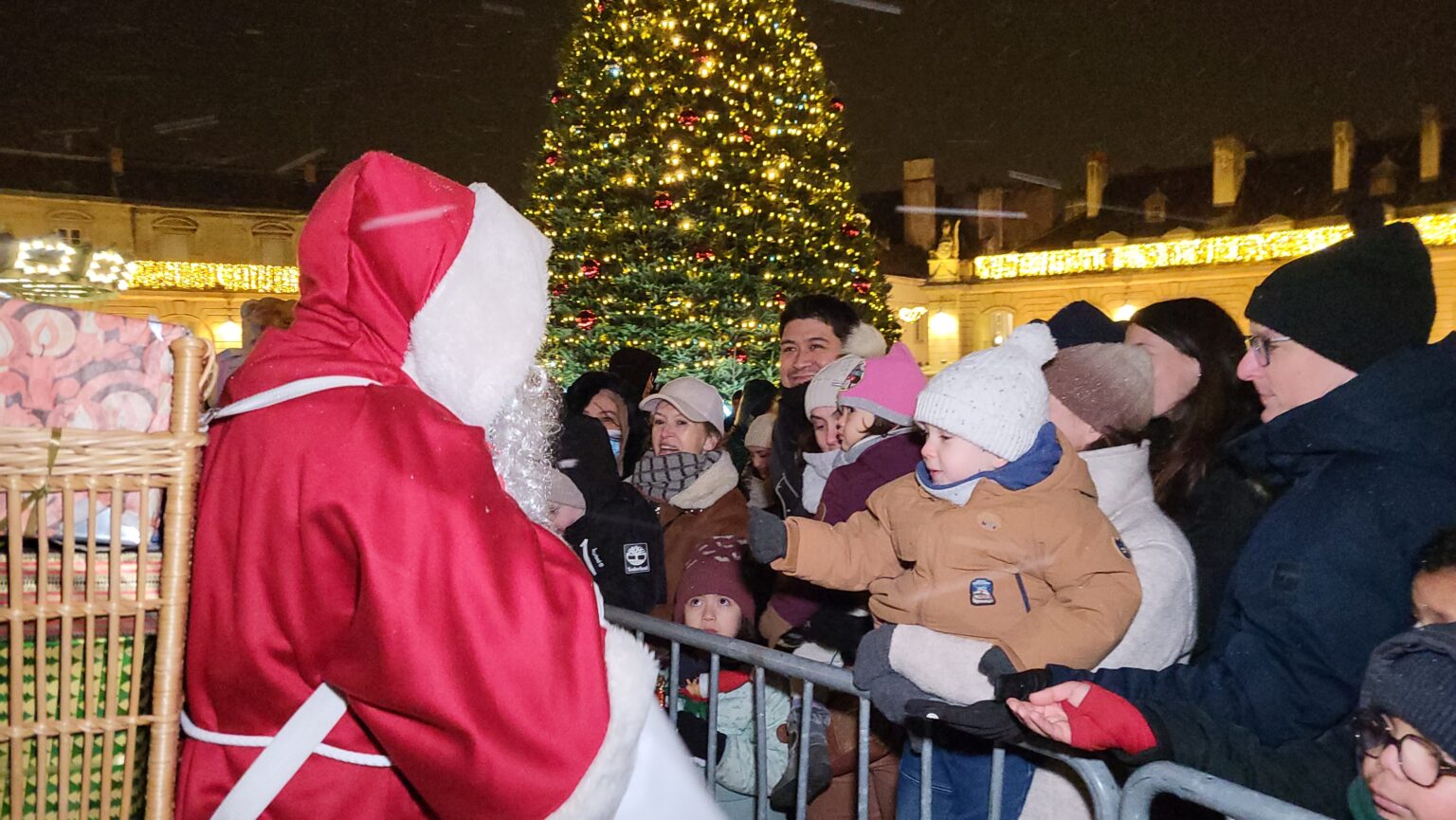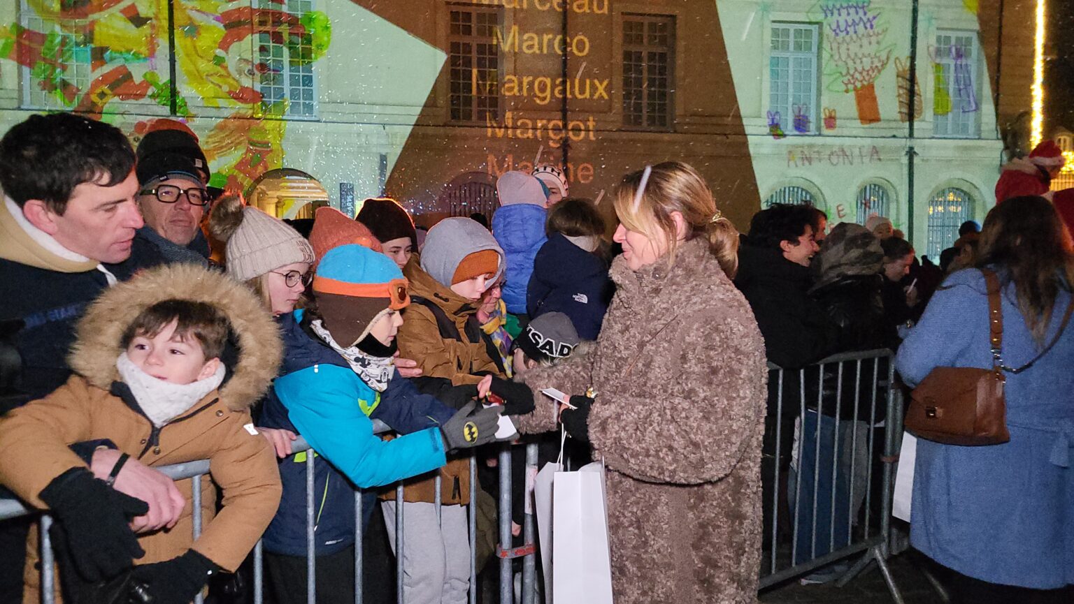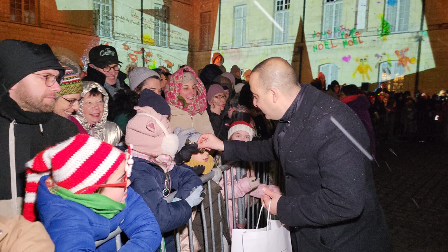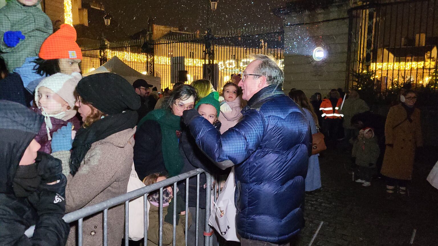 À 18 h 30 précises, le Père Noël est apparu au sommet de la tour Philippe le Bon. Selon les services municipaux, 5 000 personnes étaient alors rassemblées devant l’Hôtel de Ville. Au fil de sa descente de 46 mètres, il a été acclamé par une foule enthousiaste, avant de rejoindre le sol pour distribuer papillotes et places de manèges. Nathalie Koenders, maire de Dijon, l’a accueilli aux côtés de plusieurs élus municipaux.