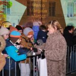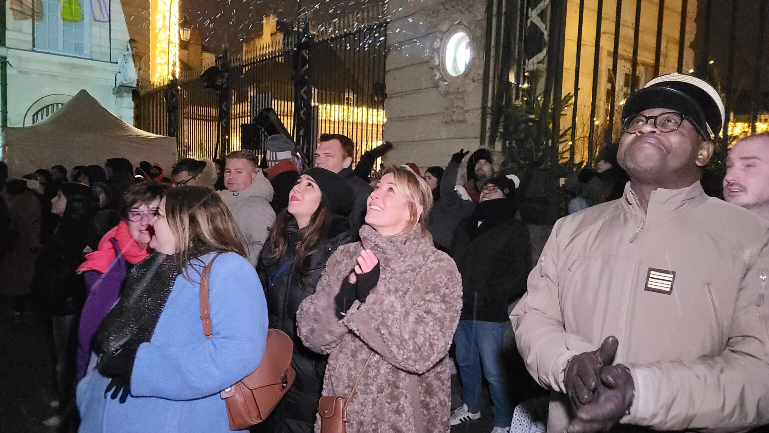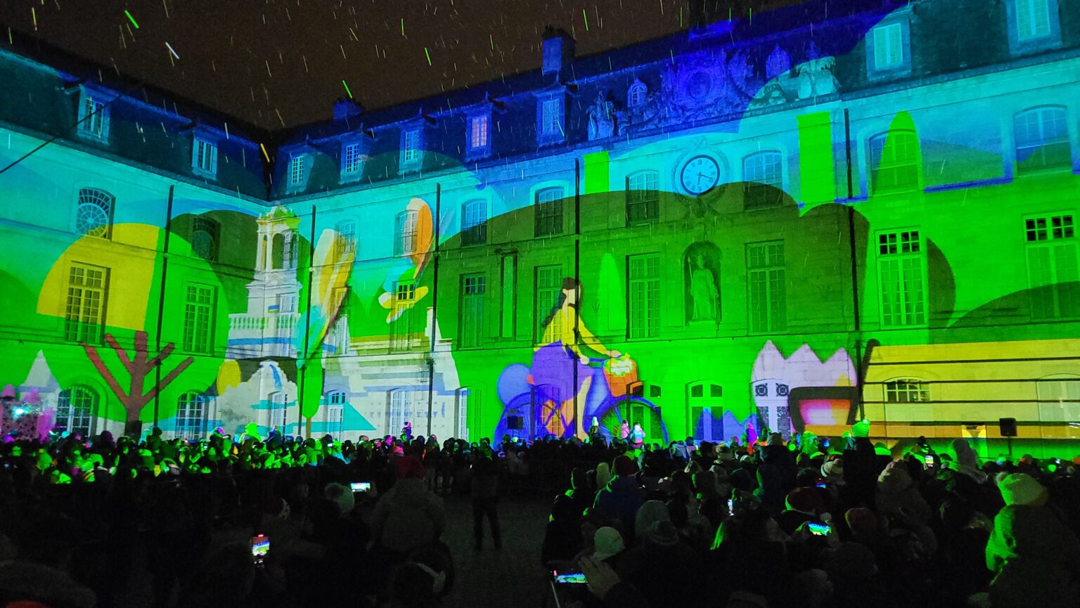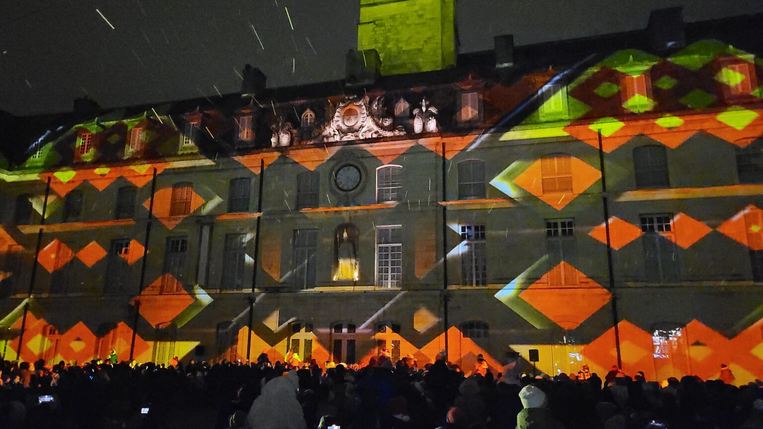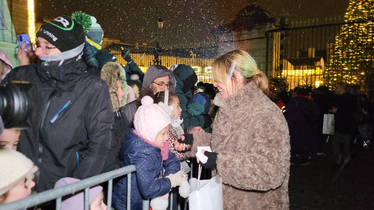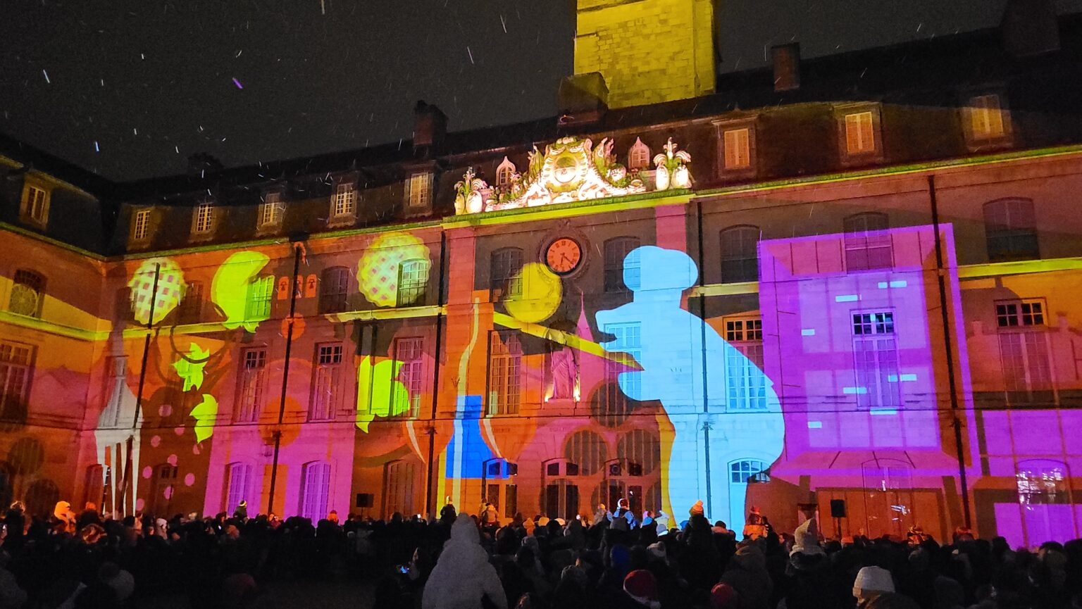 À 18 h 30 précises, le Père Noël est apparu au sommet de la tour Philippe le Bon. Selon les services municipaux, 5 000 personnes étaient alors rassemblées devant l’Hôtel de Ville. Au fil de sa descente de 46 mètres, il a été acclamé par une foule enthousiaste, avant de rejoindre le sol pour distribuer papillotes et places de manèges. Nathalie Koenders, maire de Dijon, l’a accueilli aux côtés de plusieurs élus municipaux.