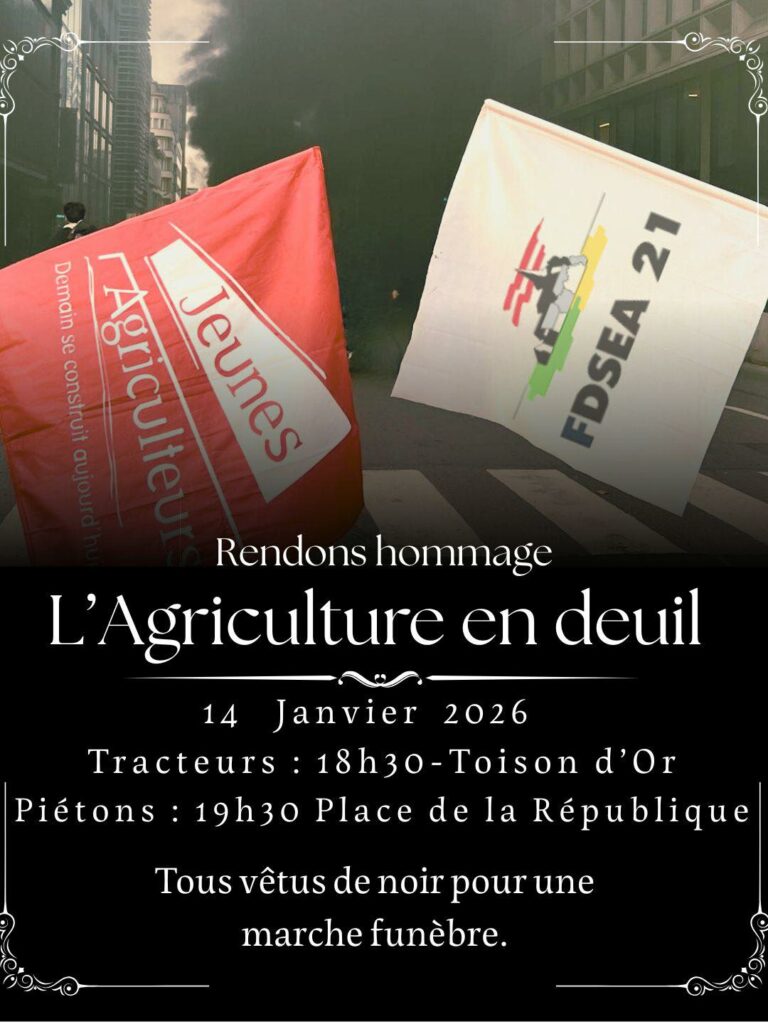 Les Jeunes Agriculteurs du département appellent à une nouvelle manifestation ce mercredi 14 janvier à Dijon, sous la forme d’une « marche funèbre pour l’agriculture française ». Dans une publication diffusée sur leur page Facebook, l’organisation explique vouloir « rendre hommage » aux fermes, aux métiers et à l’avenir du monde agricole.