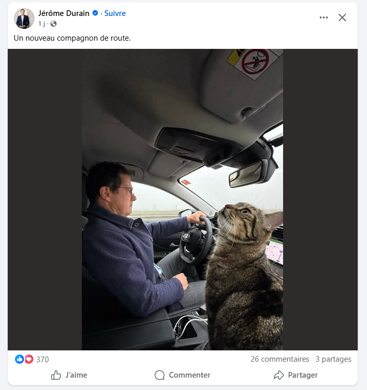 Le samedi 17 février 2025, le président de la Région Bourgogne-Franche-Comté, Jérôme Durain, a publié sur son compte Facebook une photo le montrant au volant de son véhicule, accompagné d’un chat installé à l’avant, côté passager. En légende, l’élu commente avec humour : « Un nouveau compagnon de route ».