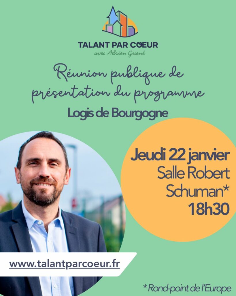 Le mouvement Talant par Cœur, avec Adrien Guené, organise une réunion publique de présentation de son programme « Logis de Bourgogne », salle Robert Schuman (rond-point de l’Europe), le jeudi 22 janvier à 18h30.