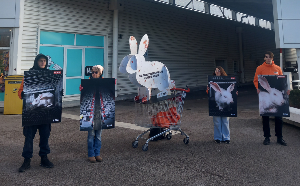 Cette mobilisation fait suite à la publication, jeudi, d’une nouvelle enquête de L214 ciblant un élevage de lapins fournissant la Filière Qualité Carrefour. Les images diffusées par l’association montrent des animaux enfermés dans des cages au sol grillagé, dans lesquelles chaque lapin ne disposerait que de l’espace d’une demi-feuille A4. Plusieurs animaux apparaissent blessés ou malades, sans recevoir de soins.