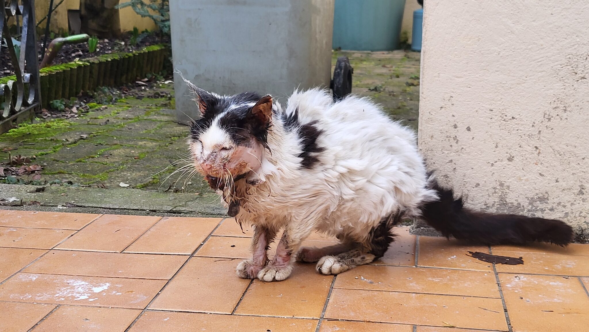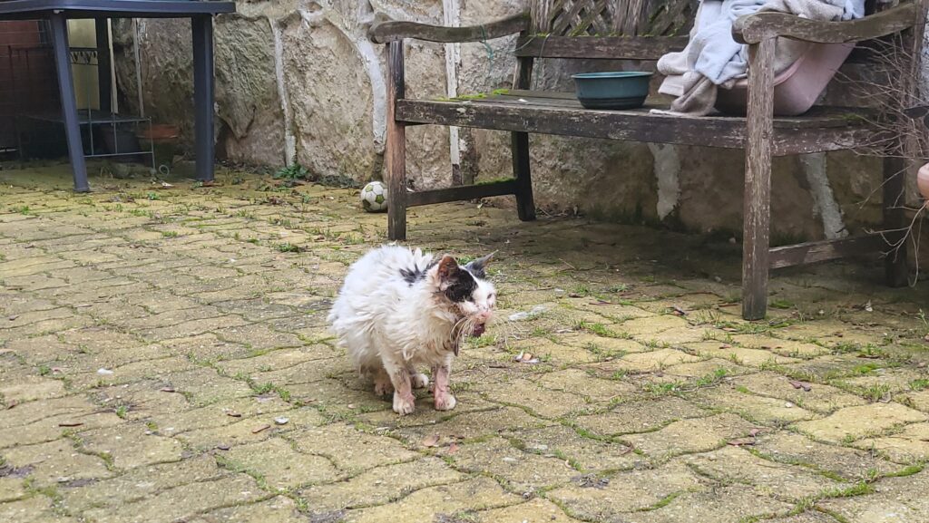 Tout commence lorsque Madame Marlène Coin remarque qu’un chat errant s’est installé devant chez elle. L’animal est dans un état inquiétant. « Il était évident qu’il avait besoin de soins », explique-t-elle. Très affaibli, le chat présente des signes de souffrance visibles.