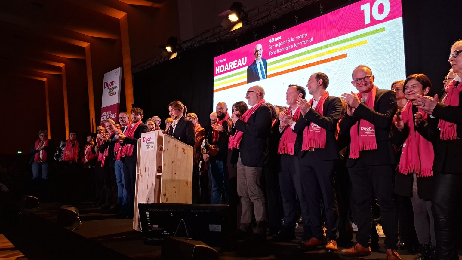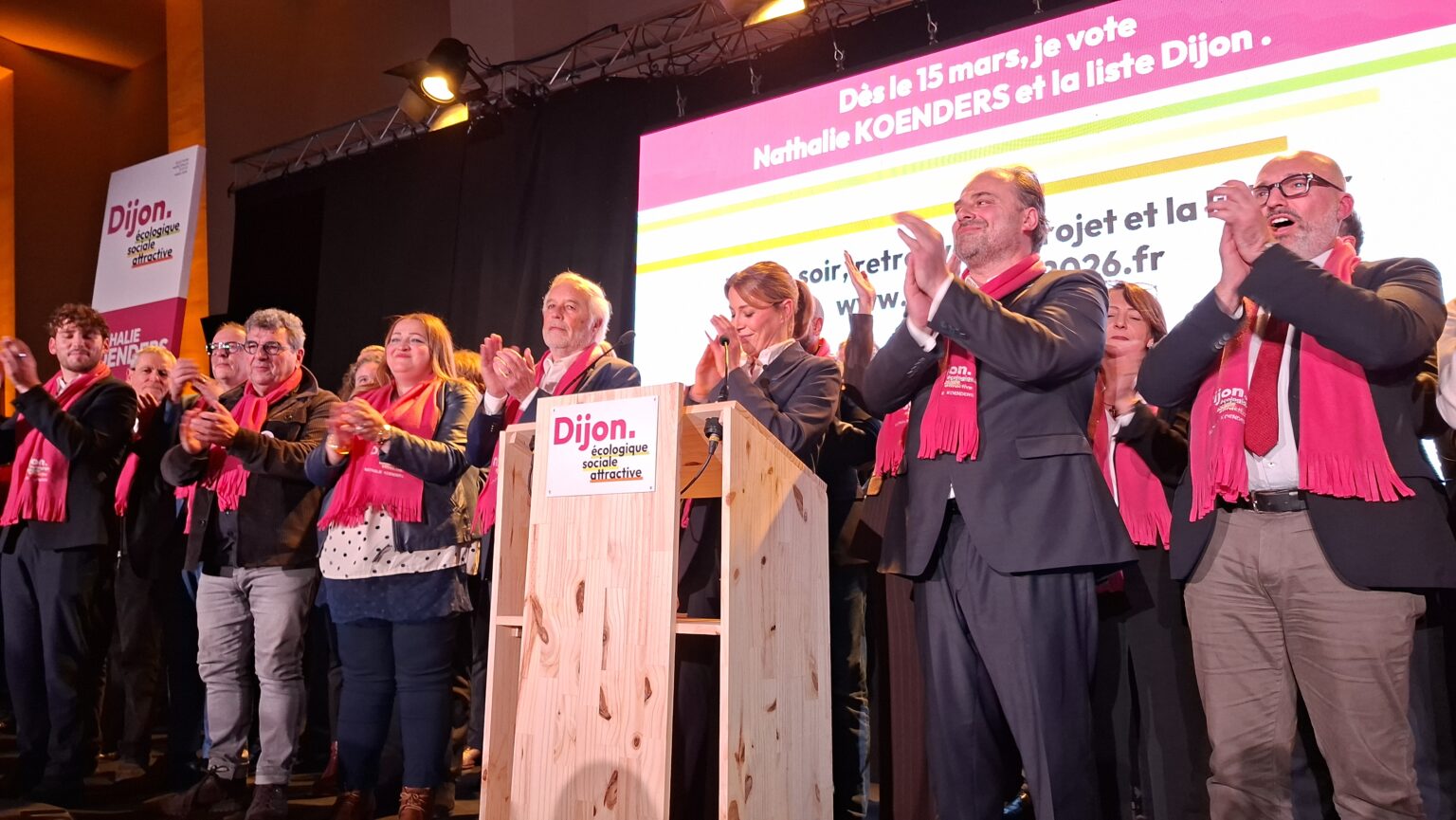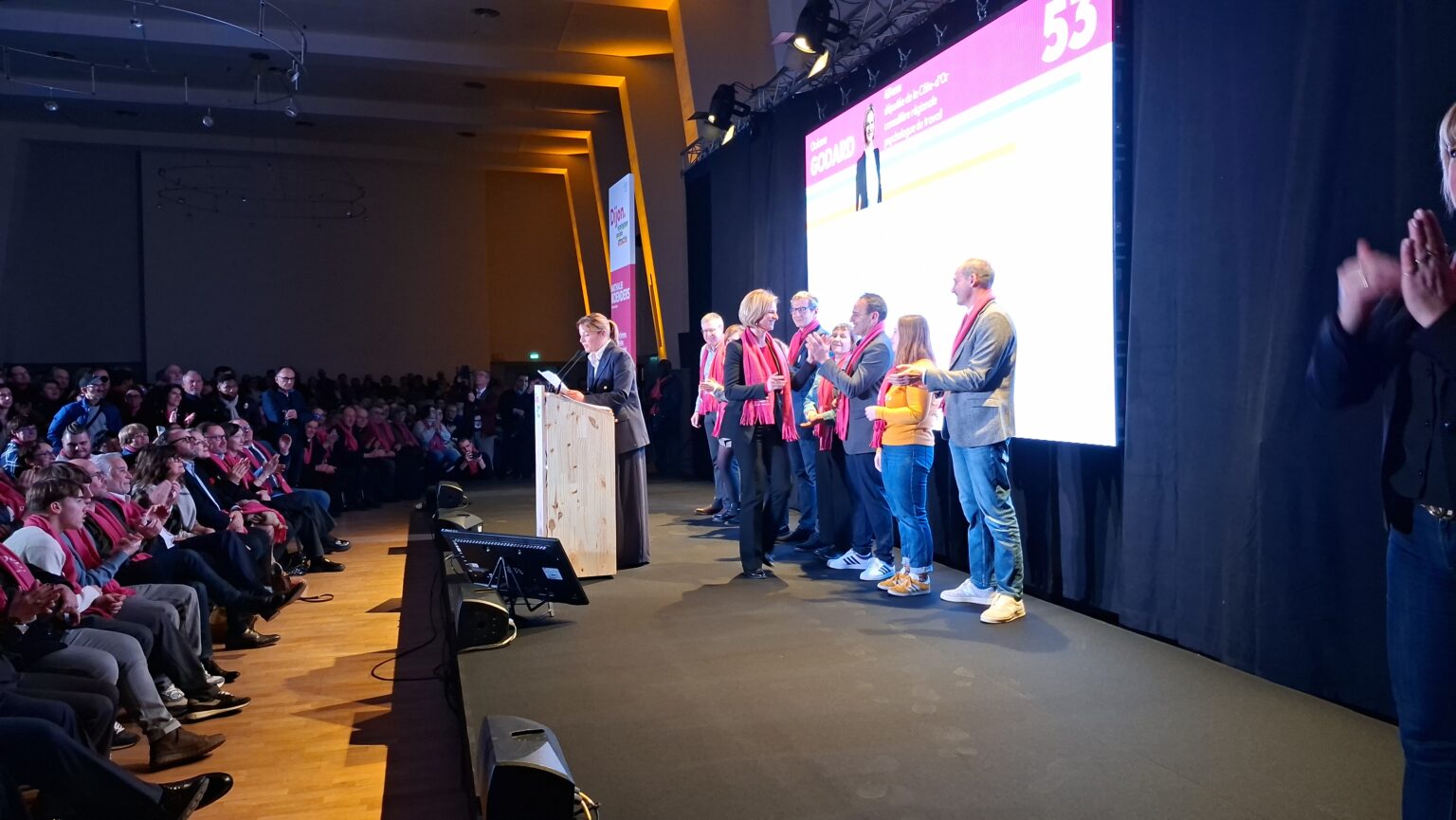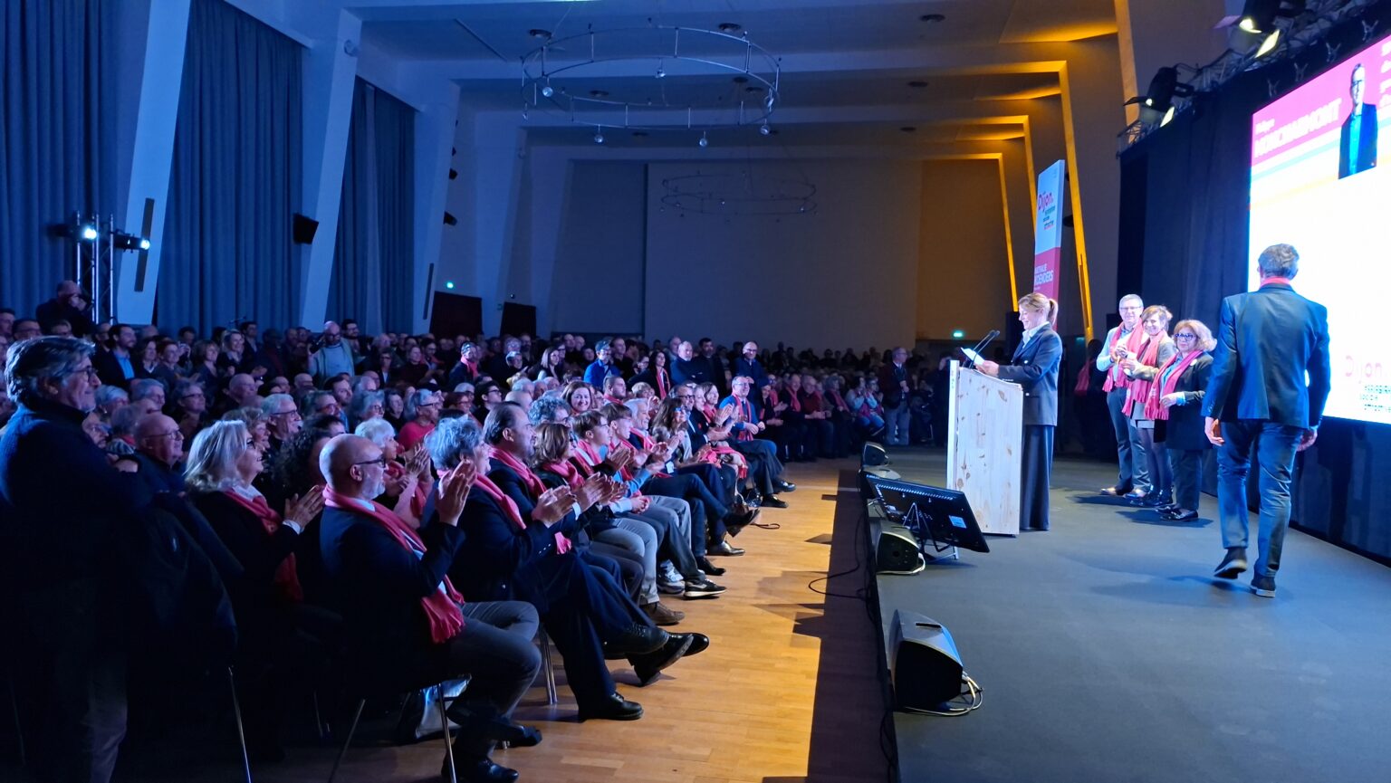 La salle Devosge a accueilli hier soir plus de 700 personnes venues assister au premier meeting de campagne de Nathalie Koenders. Dès les premières minutes, l’affluence a donné le ton : une salle comble, des équipes contraintes d’ajouter des chaises en urgence, et une atmosphère marquée par l’enthousiasme des participants.