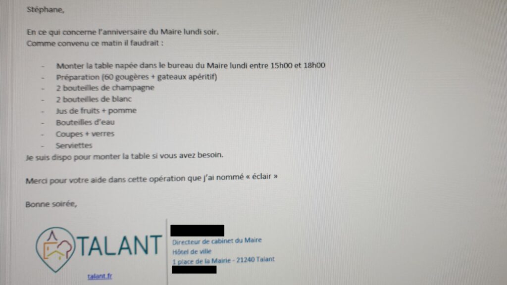 La rédaction de Dijon Actualités a été destinataire, jeudi 5 février 2026, d’un courriel anonyme présentant des documents que son expéditeur qualifie de « révélateurs » concernant l’organisation de l’anniversaire du maire de Talant en 2020. Ce message, accompagné de trois photographies, met en cause l’utilisation supposée de moyens municipaux dans le cadre d’un événement privé.