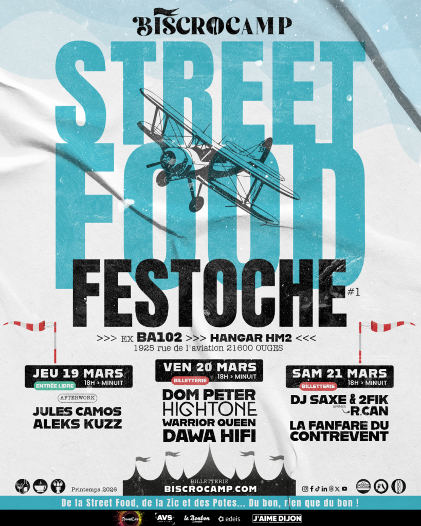 Du 19 au 21 mars 2026, l’ancienne base aérienne 102 Dijon-Longvic va vibrer au rythme des cuisines du monde, des DJ sets enflammés et des performances artistiques. Le BISCROCAMP – Comptoirs Nomades lance la première édition du Street Food Festoche, un événement d’envergure régionale qui ambitionne de devenir le rendez-vous incontournable du printemps en Bourgogne-Franche-Comté.