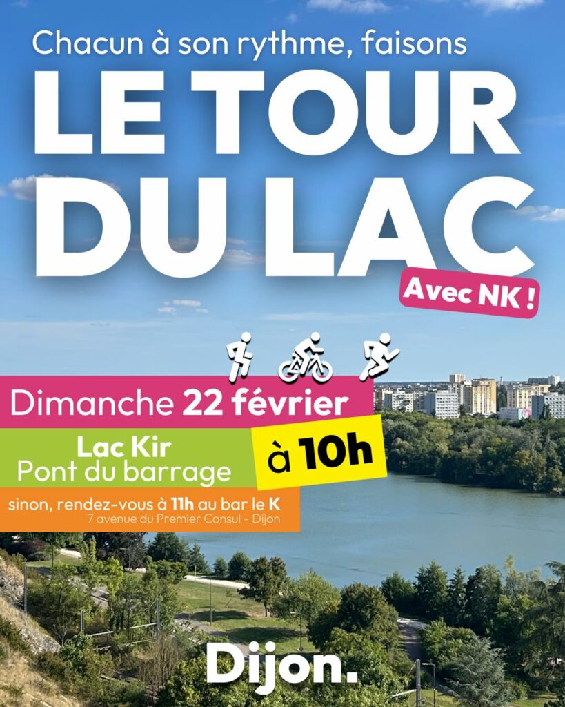 « Ce dimanche 22 février à 10h, retrouvons-nous pour faire le tour du Lac Kir avec Nathalie Koenders, chacun et chacune à votre rythme ! À pied, en courant ou à vélo, tout le monde est le bienvenu. Et pour prolonger ce moment sportif en toute convivialité, nous nous retrouverons à 11h au bar Le K pour partager un verre et échanger ensemble. »