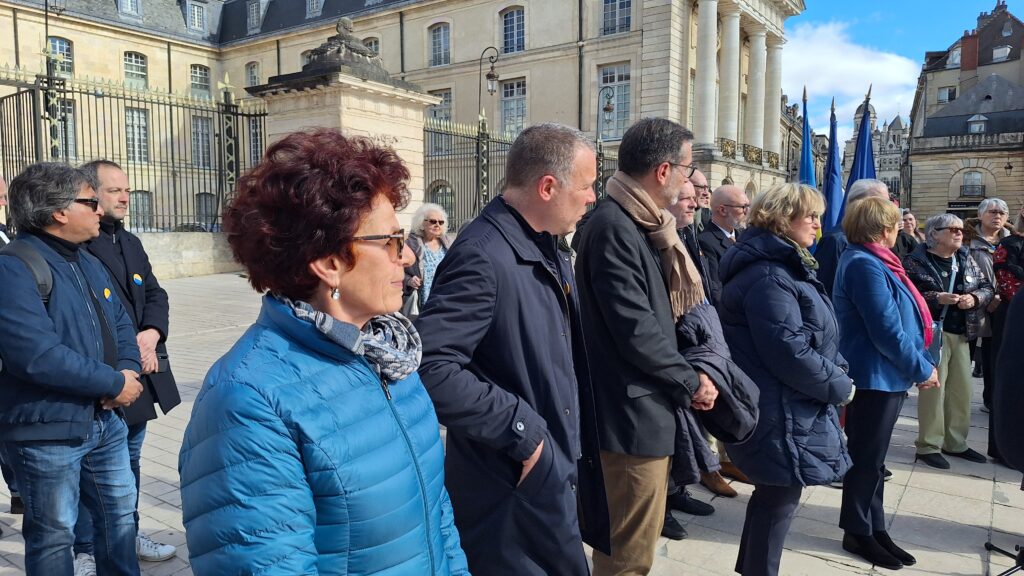 Organisé au pied de l’Hôtel de Ville, le rassemblement a mobilisé de nombreux élus, représentants d’institutions, responsables associatifs et citoyens venus affirmer leur solidarité avec le peuple ukrainien. Près de 200 personnes ont ainsi participé à ce temps de recueillement et d’engagement collectif, témoignant de l’attachement durable des Dijonnais aux valeurs de paix et de fraternité européenne.
