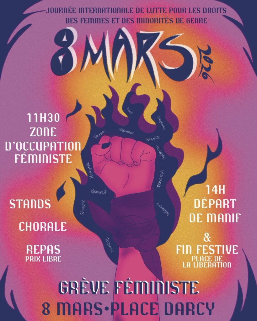 À Dijon, une mobilisation est prévue ce dimanche 8 mars 2026. La manifestation s’élancera à 14 heures depuis la place Darcy. Mais la journée de mobilisation débutera plus tôt avec l’installation d’une « Zone d’occupation féministe » à partir de 11 h 30, toujours place Darcy. Cet espace se veut à la fois militant et convivial : des stands associatifs, une chorale ainsi qu’un repas à prix libre seront proposés aux participants.