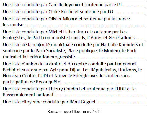 Le sondage en question a été réalisé par téléphone par l’institut Ifop entre le 27 février et le 5 mars, à la demande d’Emmanuel Bichot, candidat de la liste d’union de la droite et du centre. Selon Dijon Avenir, plusieurs habitants de Dijon contactés dans le cadre de l’enquête ont signalé que la liste citoyenne ne leur avait pas été proposée explicitement parmi les choix possibles.