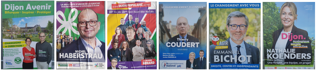Il n’est qu’à comparer les affiches de campagne des différentes listes pour voir que Dijon Avenir, met bien en avant le nom de sa liste et non celui des candidat·e·s, contrairement à la plupart des autres listes qui jouent à fond la personnification (à l’exception de Dijon Populaire et des listes de Lutte Ouvrière et du Parti des Travailleurs) :