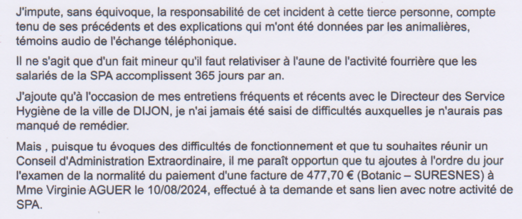 Ces éléments soulèvent une question centrale : pourquoi la SPA de Dijon a-t-elle pris en charge, ou tenté de prendre en charge, des dépenses qui semblent relever d’une situation privée ? Pour plusieurs membres et observateurs de l’association, ces pratiques interrogent sérieusement les règles de gestion interne et l’utilisation des fonds.