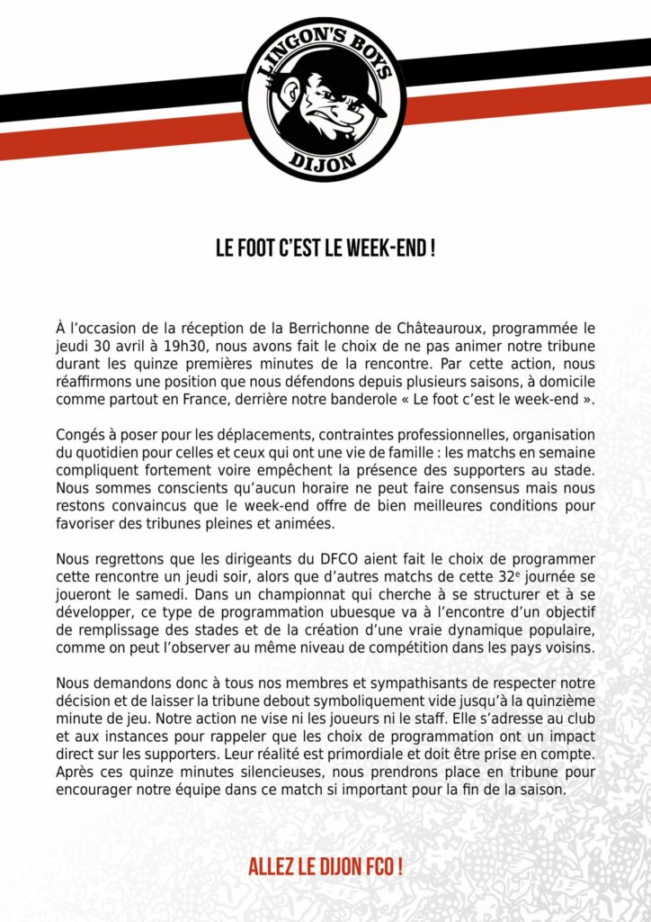 Derrière le slogan « Le foot, c’est le week-end », les supporters dijonnais entendent dénoncer une tendance qu’ils jugent néfaste pour l’ambiance des stades et, plus largement, pour la place des fans dans le football français. Une position qu’ils affirment défendre « depuis plusieurs saisons », aussi bien à domicile que lors des déplacements. Cette fois, ils ont choisi de passer à une forme de protestation concrète afin de rendre leur message plus visible.