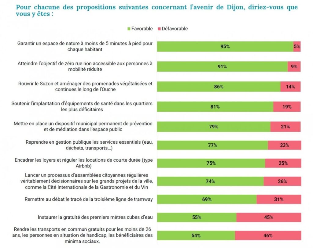 Plusieurs propositions du programme recueillent une adhésion extrêmement forte. 95 % des Dijonnais se déclarent favorables à l’objectif de garantir à chaque habitant un espace de nature à moins de cinq minutes à pied de son domicile. 91 % soutiennent l’ambition de rendre toutes les rues accessibles aux personnes à mobilité réduite. La proposition visant à rouvrir le Suzon et aménager des promenades végétalisées continues le long de l’Ouche recueille également un très large soutien avec 86 % d’avis favorables.