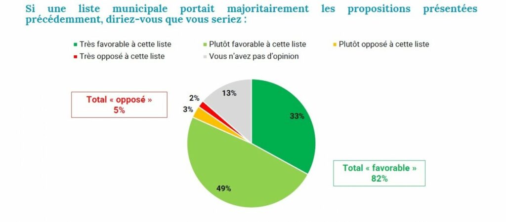 Mais le résultat le plus marquant concerne l’appréciation globale du projet : 82 % des Dijonnais déclarent qu’ils seraient favorables à une liste municipale portant majoritairement ces propositions, dont 33 % très favorables et 49 % plutôt favorables. Seuls 5 % s’y disent opposés, tandis que 13 % ne se prononcent pas.